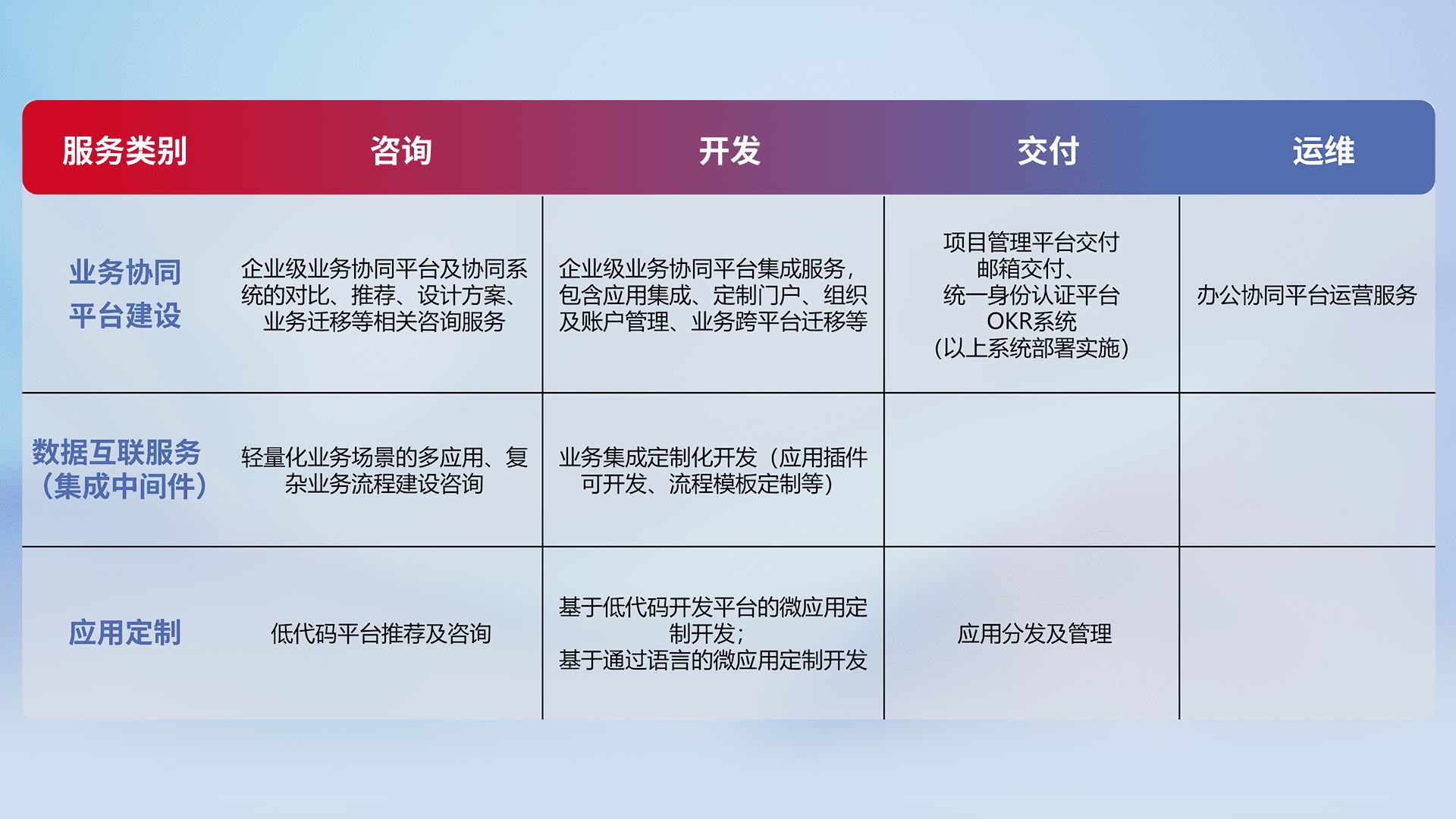 针对钉钉、、、企微、、IDaas等平台级产品提供产品的规划、、、、方案、、、、交付、、定制化开发等服务,,实现如统一协同办公、、智能客户服务、、混合会议管理、、、、智能数据查询、、、、等业务场景,,,实现数字化转型。。